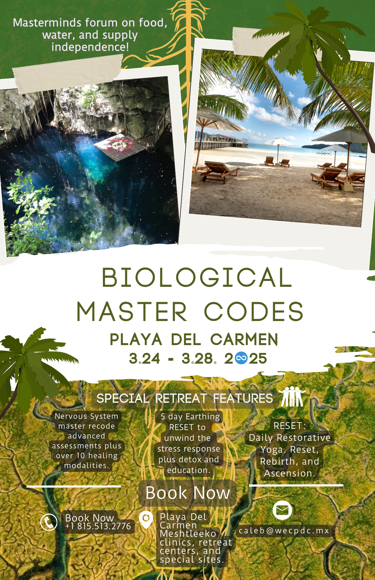 - Biological Master Codes back to nature with and best version of self with nervous system rewrite and regulation, detox, earthing under the stars beachfront lunada, forum on food, water and supply chain sovereignty, day at private centote mineral waters of manifestation, daily restorative yoga, workshops, local events, gourmet intermittent feasting (fasting), Mayan ruins special sites activations meditation and more….