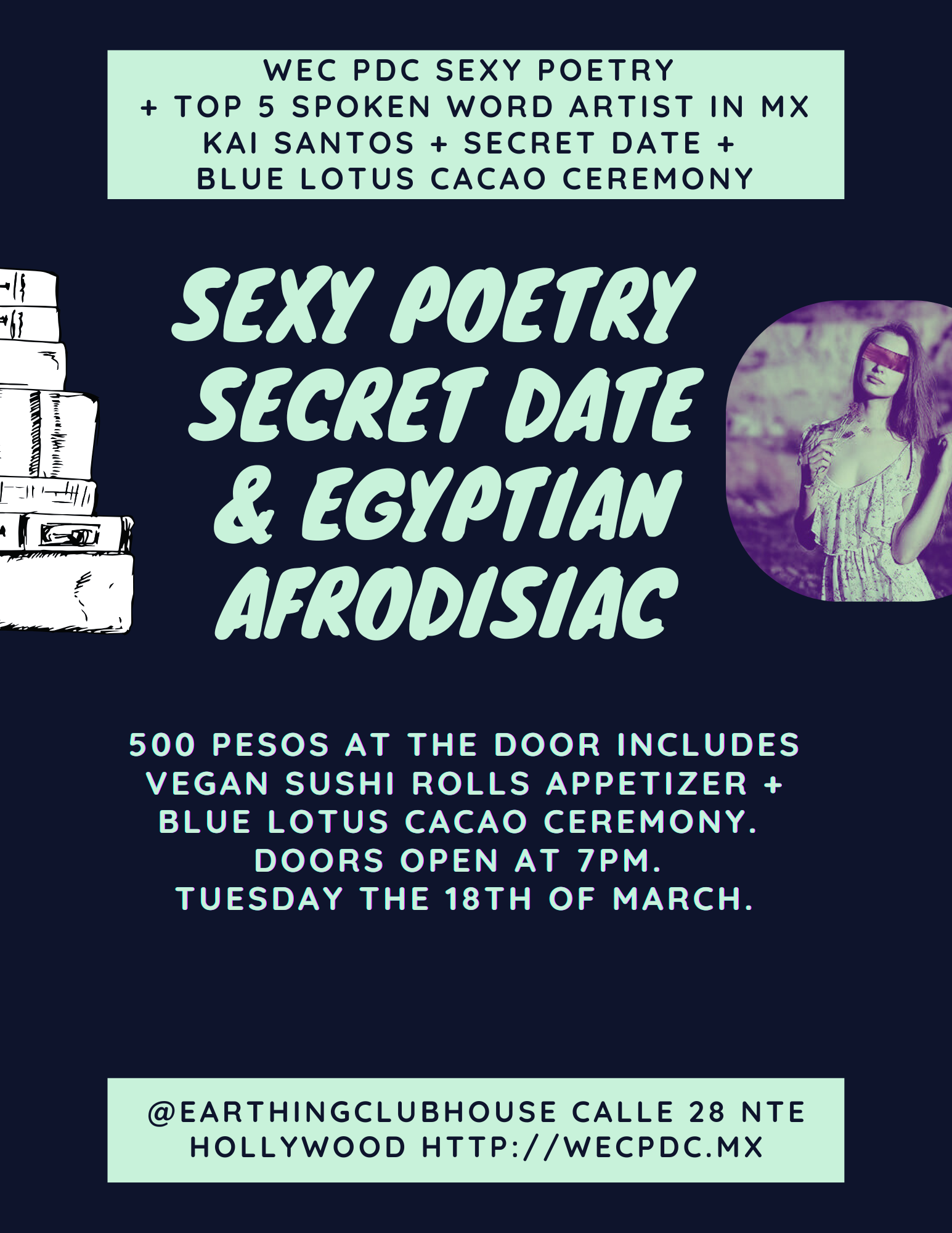- Blue lotus Egyptian and other aphrodisiacs cacao ceremony followed by sexy poetry, vegan sushi, and open mic! Secret Date set up after blind folded poetry reading. Kai Santos hosting ranked top 5 SW artists in Mexico. Featuring earthing mats and quantum healing devices.